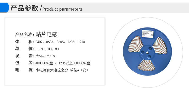 體積:0402、0603、0805、1206、1210單位:H、NH、UH、MH誤差:±5%、±10%包裝:4000PCS/盤 、1206以上3000PCS/盤電流:小電流和大電流之分 單位A(安)